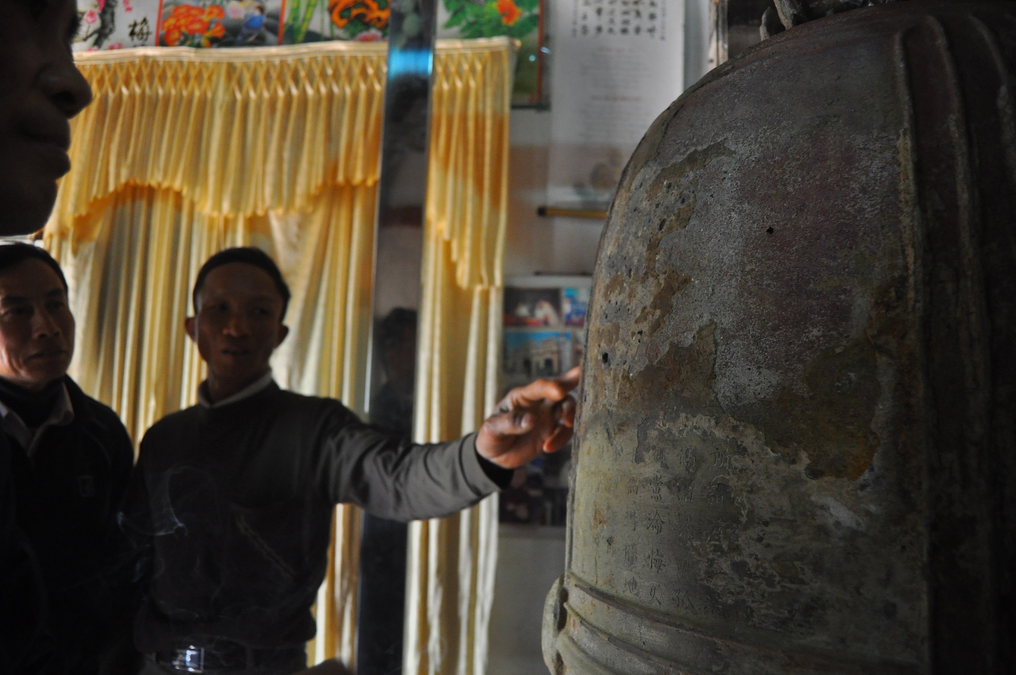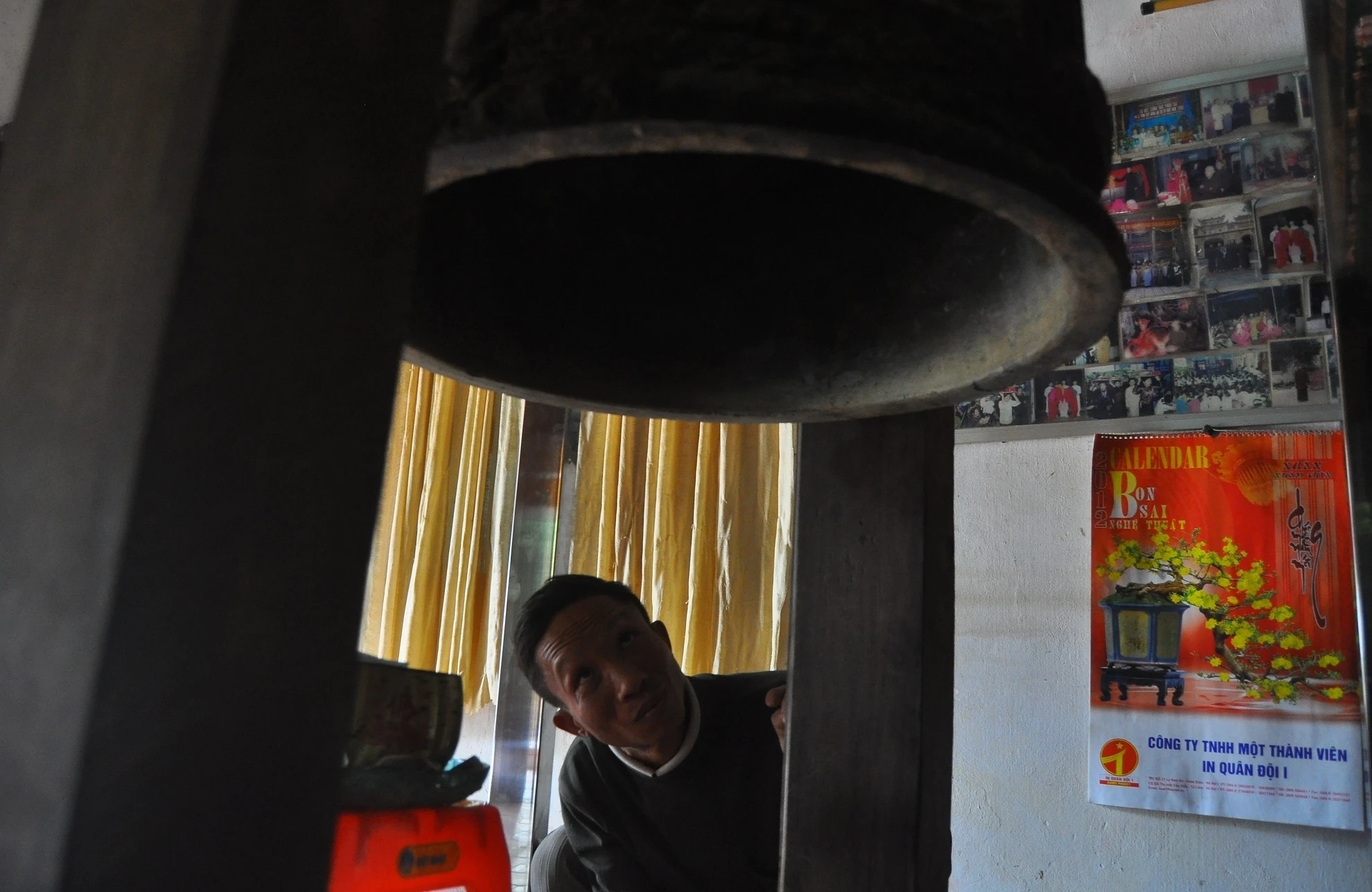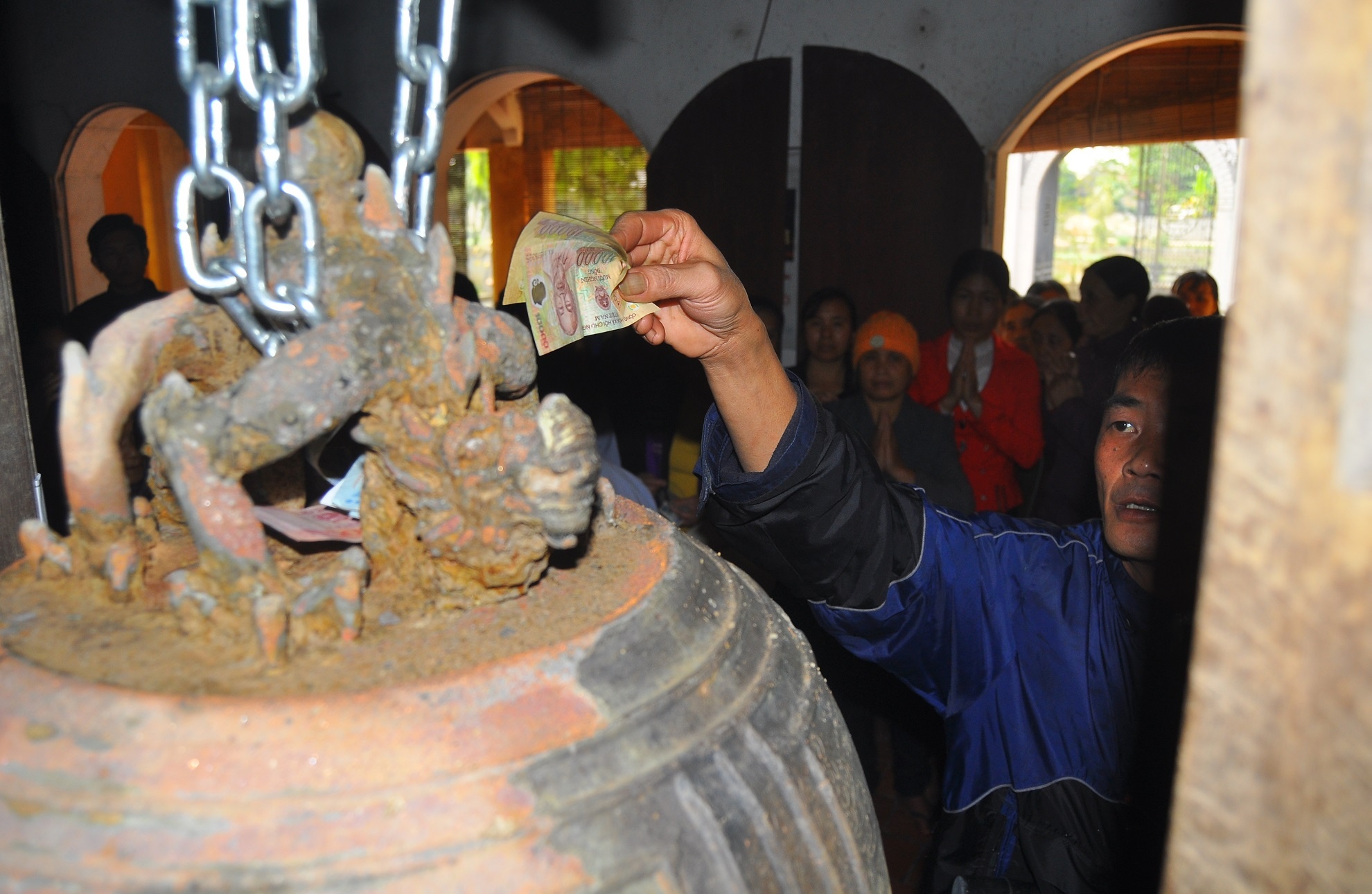 | Nhiều người còn đặt tiền lên quai chuông, khấn vái và coi đây là bảo vật mang lại nhiều may mắn cho dân làng. |