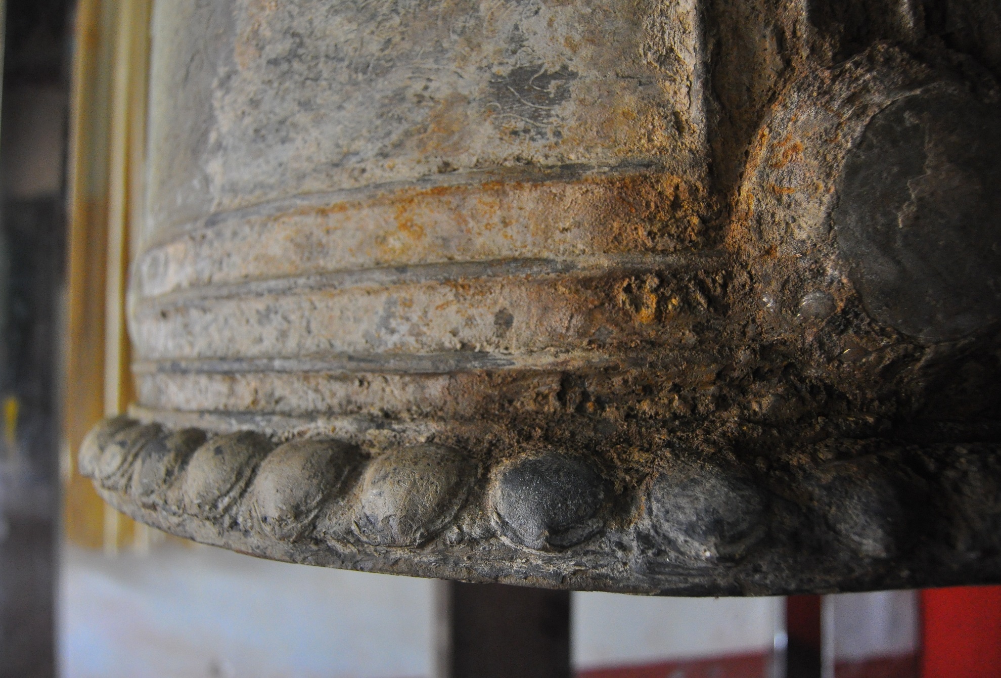 | Nửa dưới chuông cổ được đúc hàng chục cánh sen ở xung quanh. Mặt trên khắc chìm hình ảnh rồng bay, voi chiến, trâu, ngựa và hình ảnh cành lá chim muông rất đẹp. |