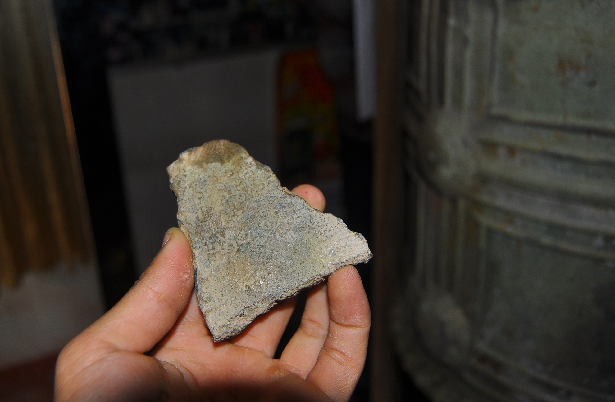 | Mảnh lư hương bị vỡ cũng được đúc bằng đồng có nhiều ký tự chứ Hán được phát hiện cùng với chuông đồng. |