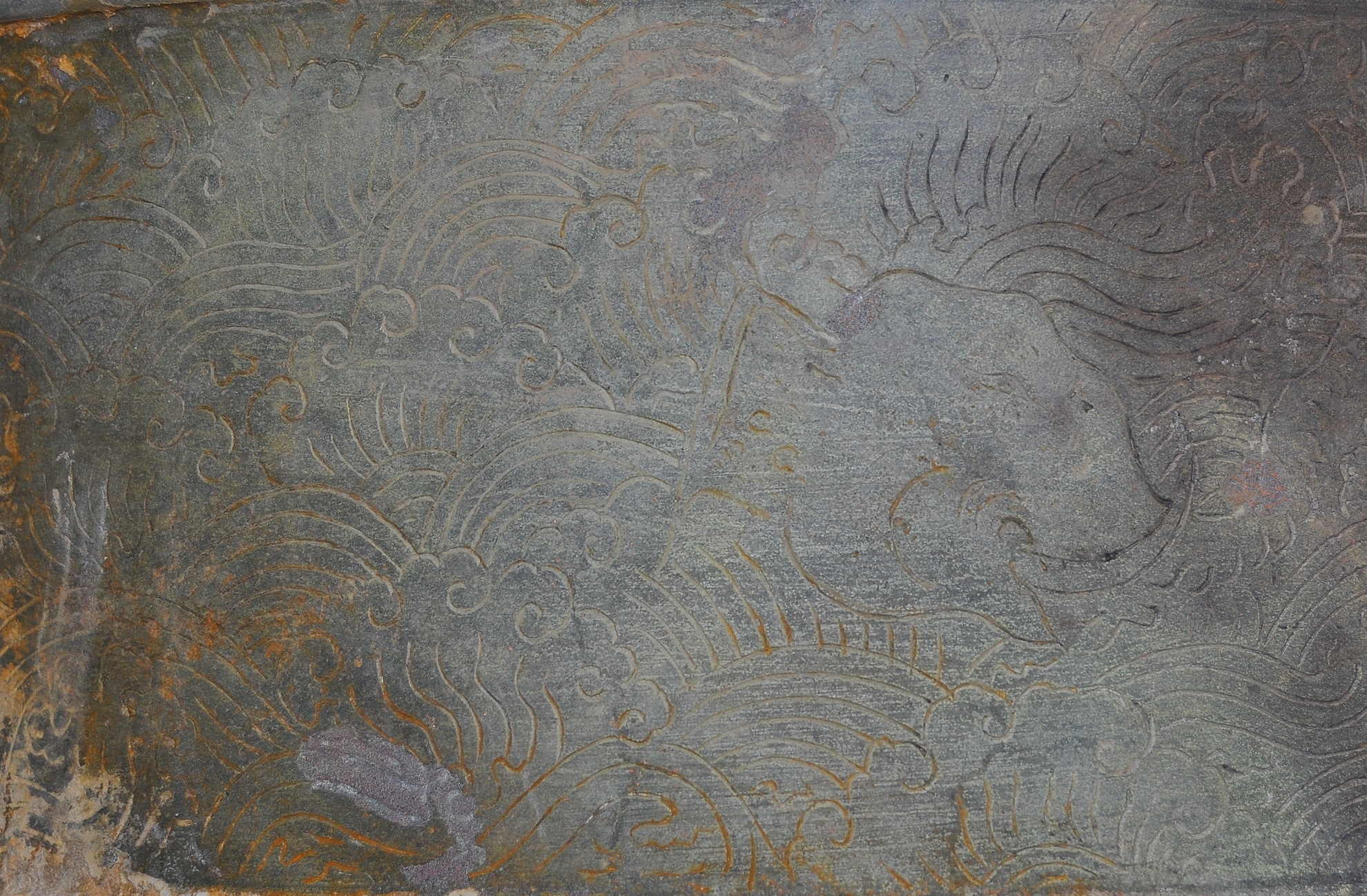 | Hình ảnh được cho là voi chiến được khắc họa tỉ mỉ. Nhiều hình ảnh rồng, trâu, ngựa đã trầy xước, bong tróc do thời gian nằm lâu dưới lòng đất. |