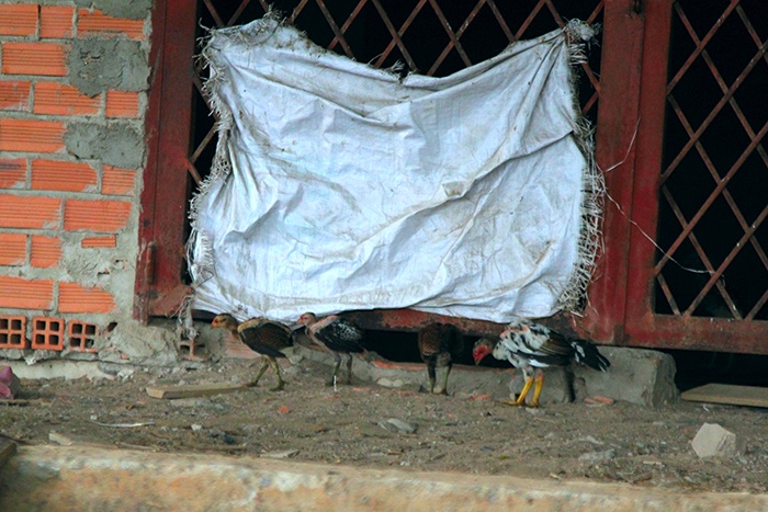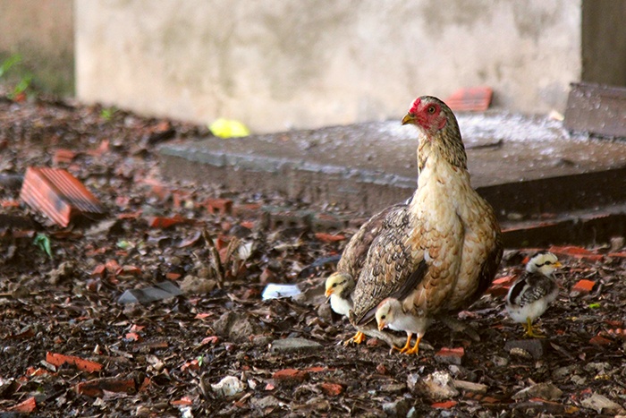 | Một đàn gà đang kiếm ăn trên nền nhà còn vương nhiều mảnh gạch xây dựng dang dở. |
