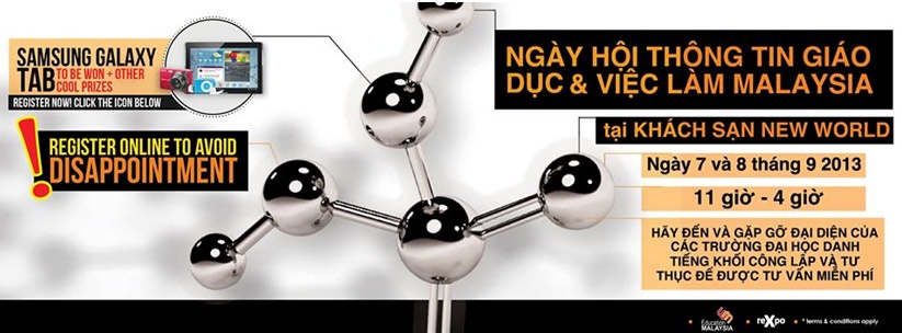 Ngày 7 và 8/9/2013 thời gian từ 11-16h tại khách sạn New World (Q.1, TP.HCM), ngày hội thông tin du học Malaysia với hơn 15 trường đại học khối công lập và tư thục: