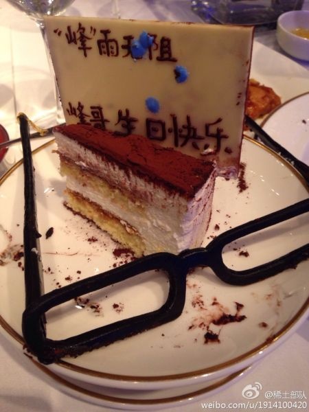 Với một cặp kính đen, không khó để người hâm mộ hâm mộ nhận ra chiếc bánh được mô phỏng theo đúng hình ảnh đặc trưng của chàng rocker điển trai - người đã công khai tình cảm với Chương Tử Di hồi cuối năm 2013. Không những thế, chiếc bánh còn được trang trí kèm dòng chữ "Gió mưa cũng không thể ngăn trở, Phong ca, chúc mừng sinh nhật!".