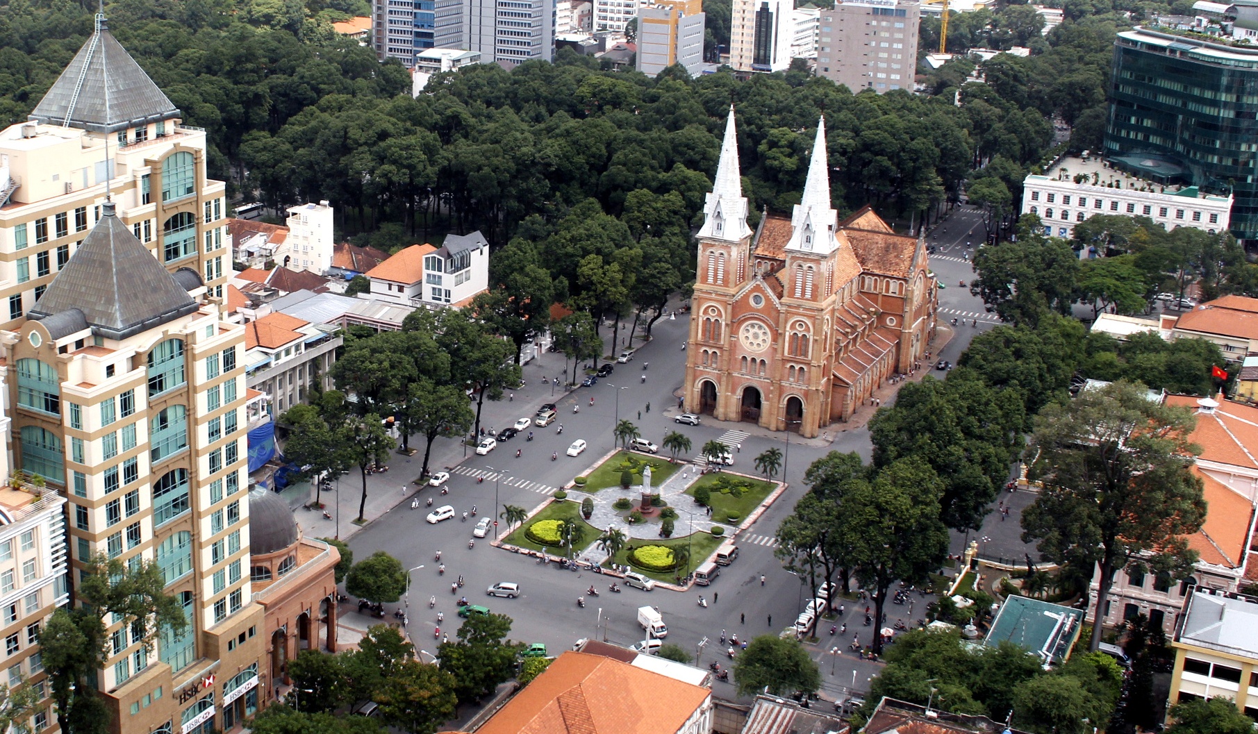 | Nhà thờ Đức Bà được đặt viên đá đầu tiên bởi giám mục Isidore Colombert vào ngày 7/10/1877, khánh thành 3 năm sau (11/4/1880). Ban đầu, công trình có tên gọi là Nhà thờ Nhà nước do Pháp bỏ tiền xây dựng và quản lý. Năm 1895, nhà thờ được xây thêm hai tháp chuông (cao 57,6 m) với 6 chuông đồng lớn nặng gần 29 tấn. Đỉnh tháp có một cây thánh giá cao 3,5 m, ngang 2 m, nặng 600 kg. Năm 1958, Linh mục Giuse Phạm Văn Thiên đã đặt tạc tượng Đức mẹ Hòa Bình bằng đá cẩm thạch trắng Carrara của Ý và chuyển về Sài Gòn 1959. Từ đó, người dân bắt đầu quen với tên gọi là nhà thờ Đức Bà. Ngày 5/12/1959, Tòa thánh cho phép làm lễ "xức dầu", tôn phong Nhà thờ Chính tòa Sài Gòn lên hàng tiểu Vương cung thánh đường (basilique). Từ đó, tên gọi chính thức của thánh đường là Vương cung thánh đường Đức Bà Sài Gòn. Ngày nay, Nhà thờ toạ lạc ngay trung tâm Q.1, là điểm tham quan của rất nhiều du khách trong và ngoài nước. Nó cũng là một trong những công trình kiến trúc cổ tiêu biểu của TP.HCM. |