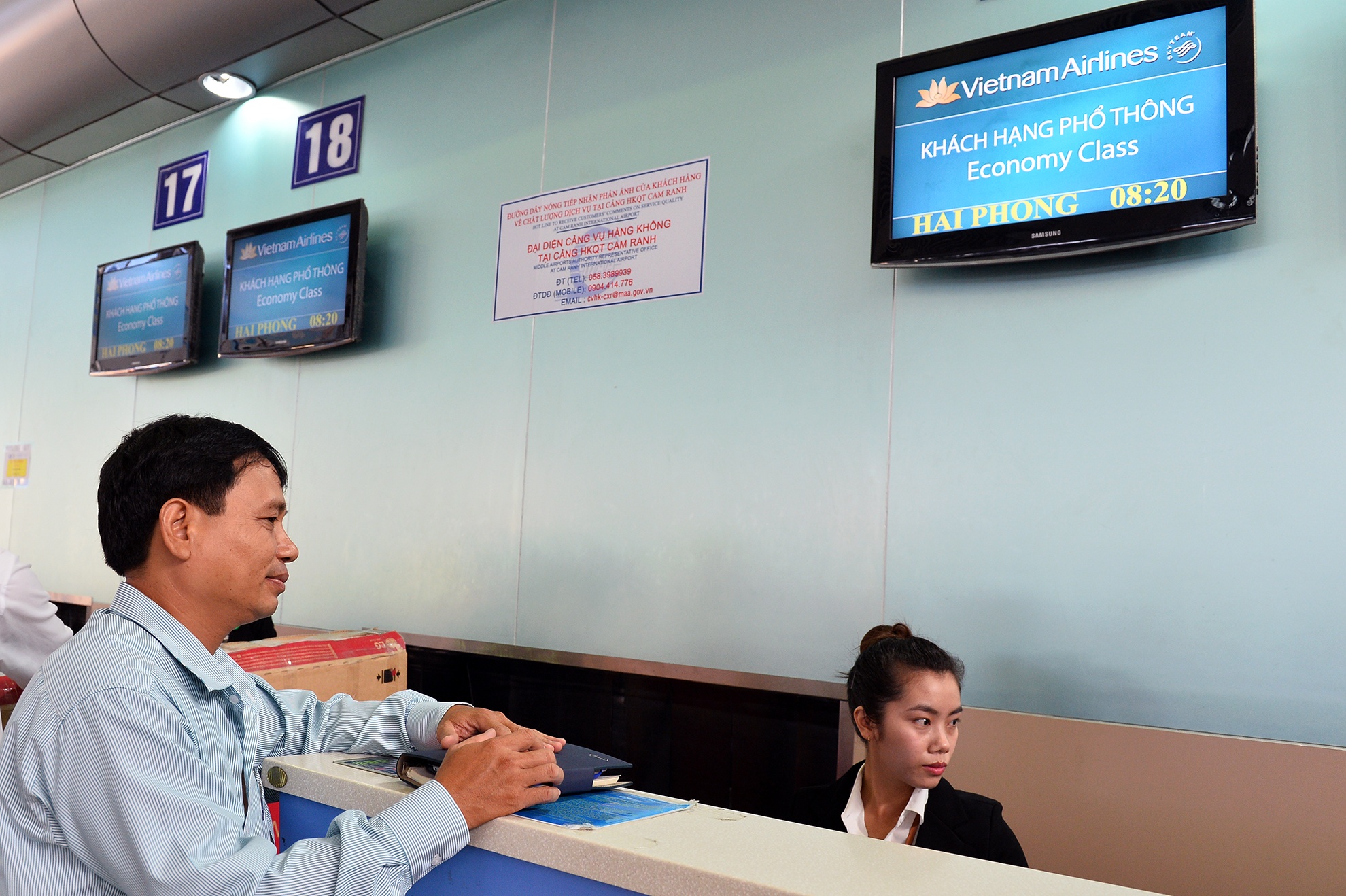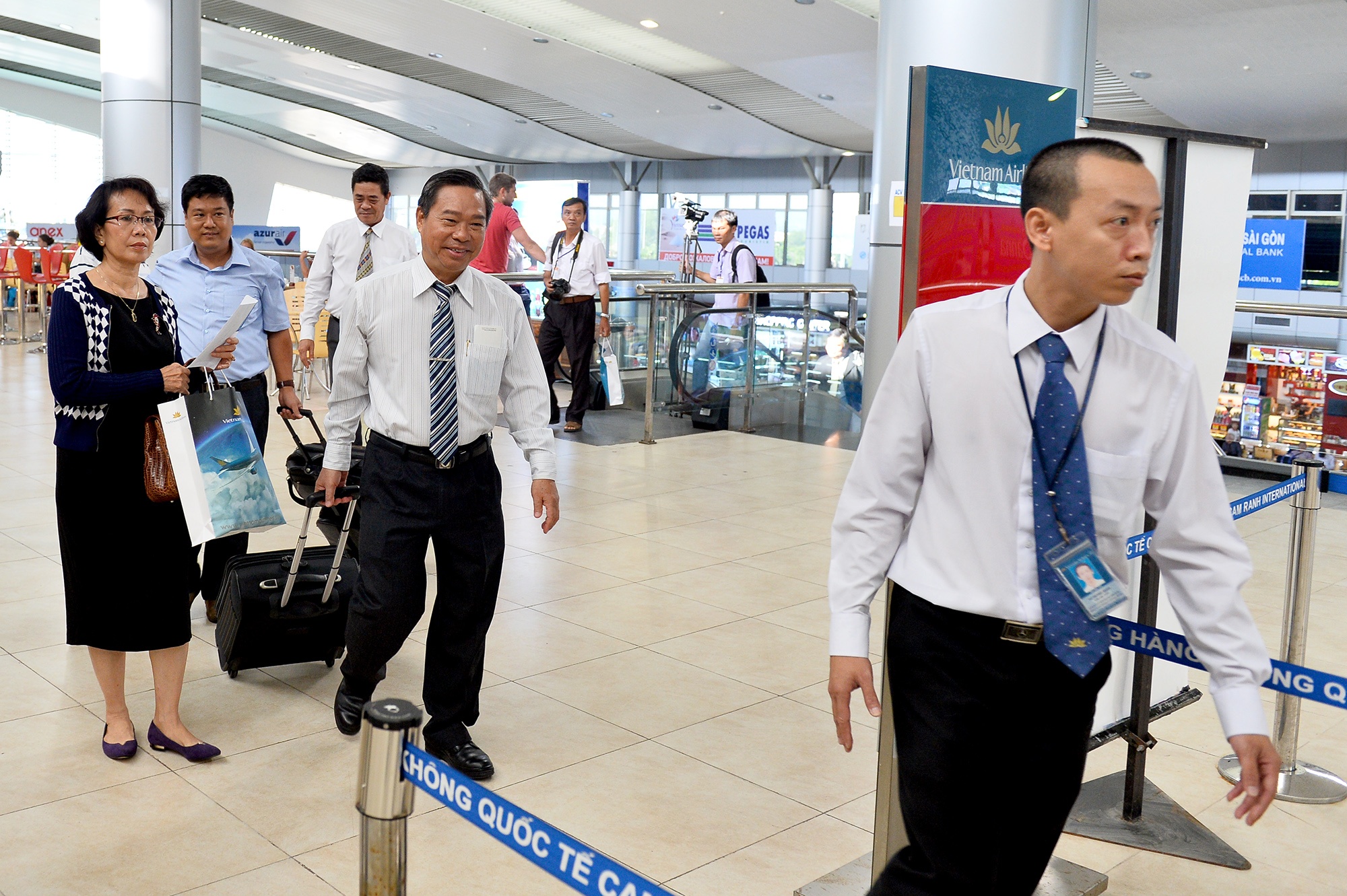 | Ông Đỗ Văn Thái, một trong những hành khách đầu tiên của chuyến bay đến sớm làm thủ tục tại quầy check-in lúc 7h sáng. |