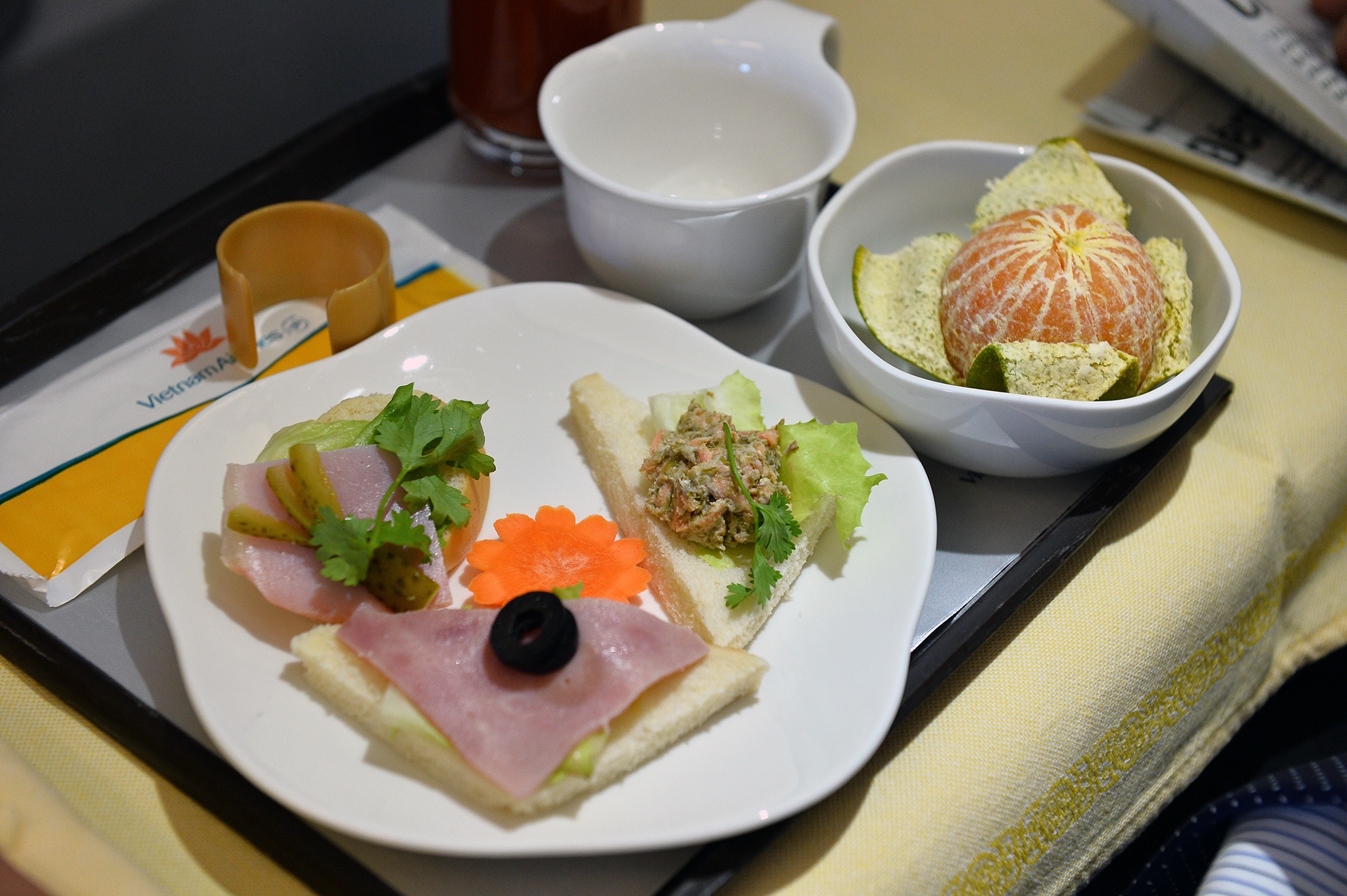 | Trong hành trình, khách sẽ được phục vụ suất ăn nhẹ và nước uống. Trong ảnh là suất ăn tại khoang thương gia. |