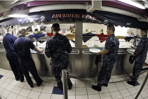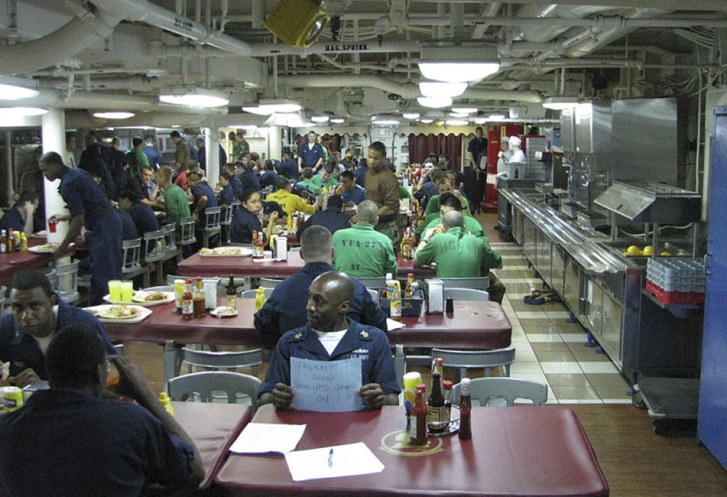 5.000 người làm việc trên tàu sân bay phải xếp hàng chờ tới lượt lấy thực phẩm mỗi sáng. Đoàn người kéo dài trong nhà ăn và tràn ra cả hành lang và cầu thang lên xuống của tàu. Đầu tiên, các thủy thủ cần quan sát bảng thực đơn chọn món trước khi lấy khay và dĩa để lấy đồ ăn.