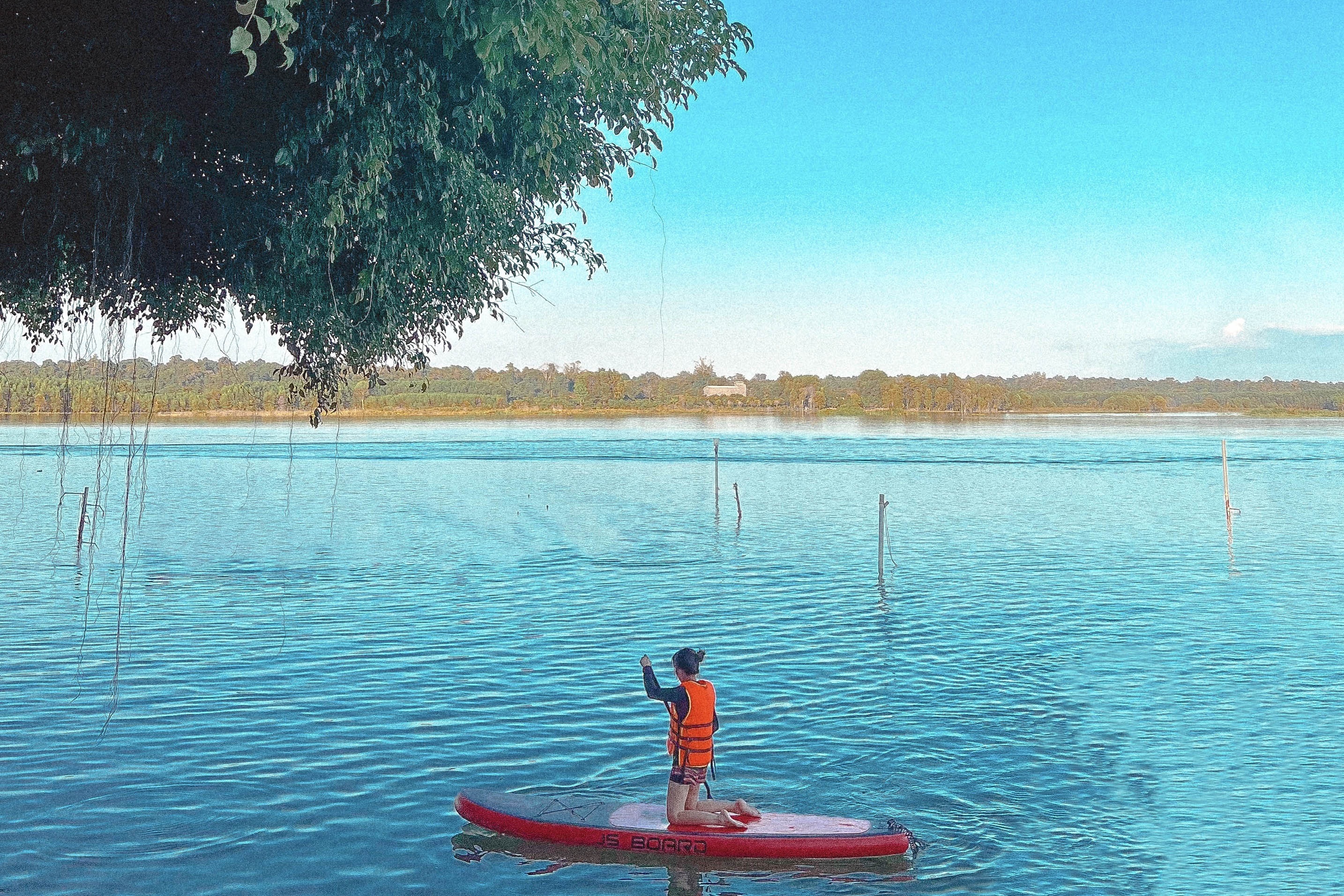 Sau thời gian nghỉ ngơi ngắn, cả nhà chuẩn bị đồ đạc đi bơi, chèo SUP, trải nghiệm cano trên hồ. Tôi thích hoạt động nhất này vì các thành viên dễ dàng kết nối và có thêm nhiều năng lượng. Giá chèo SUP là 200.000 đồng/người.
