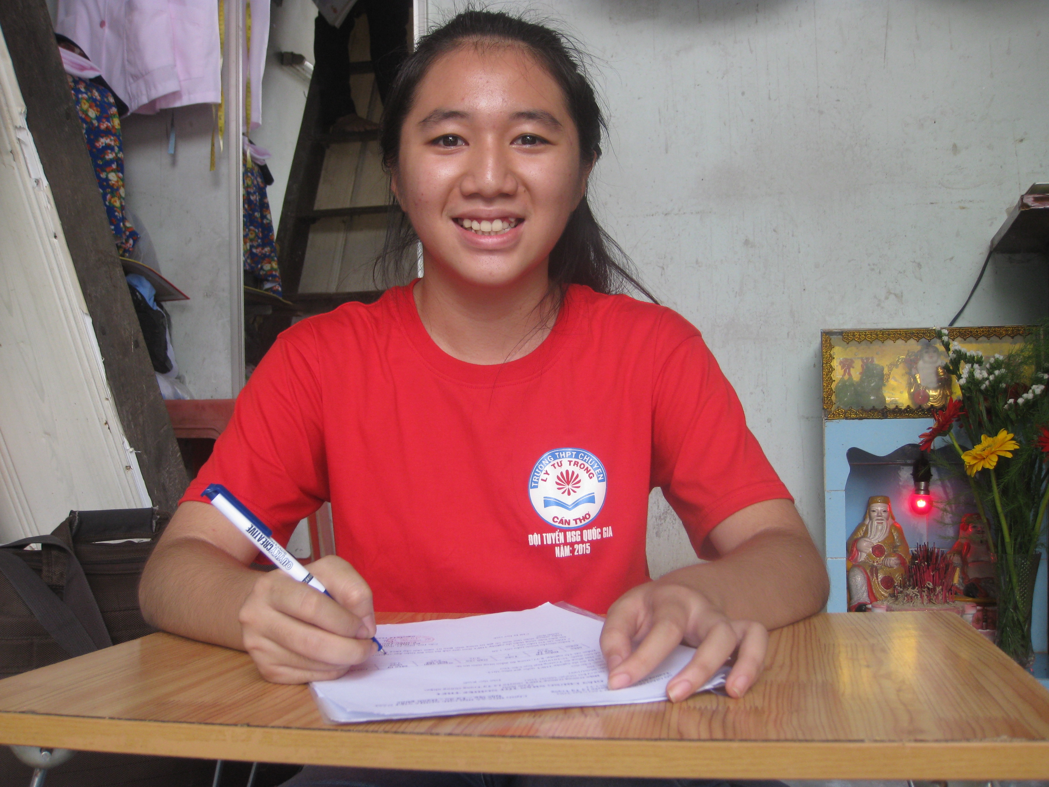 Địa lý 10 điểm, sử 6,5 điểm, văn 7,25 điểm. Với tổng số điểm 23,75 Nhi sẽ đăng ký xét tuyển vào ngành sư phạm địa lý Trường ĐH Cần Thơ. Nhi thổ lộ: “Em muốn theo đến cùng môn địa. Vả lại cha đã rất vất vả vì chúng em nên em chọn học sư phạm để khỏi đóng học phí. Và em cũng muốn truyền đam mê học môn địa đến các thế hệ học sinh sau này”.