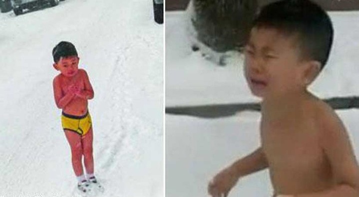 | Bé Duoduo cởi trần để chạy trên tuyết tại thành phố New York vào năm 2012. Ảnh: Sina. |