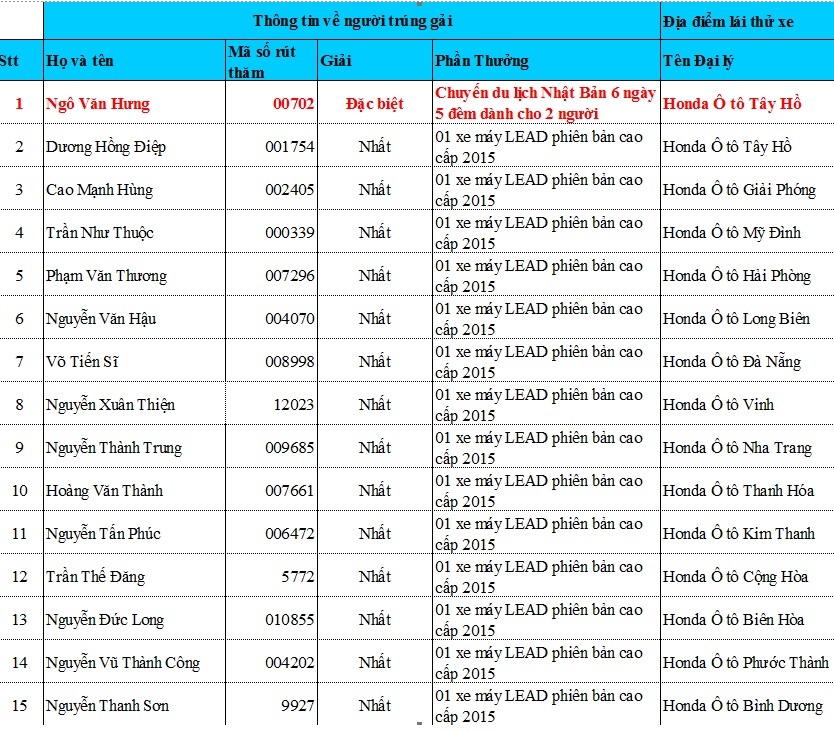 Ngay sau khi chương trình kết thúc, buổi lễ rút thăm trúng thưởng đã được diễn ra lần lượt vào 18/1 tại 14 đại lý Honda ôtô để tìm ra 14 giải nhất và 1.050 giải nhì.