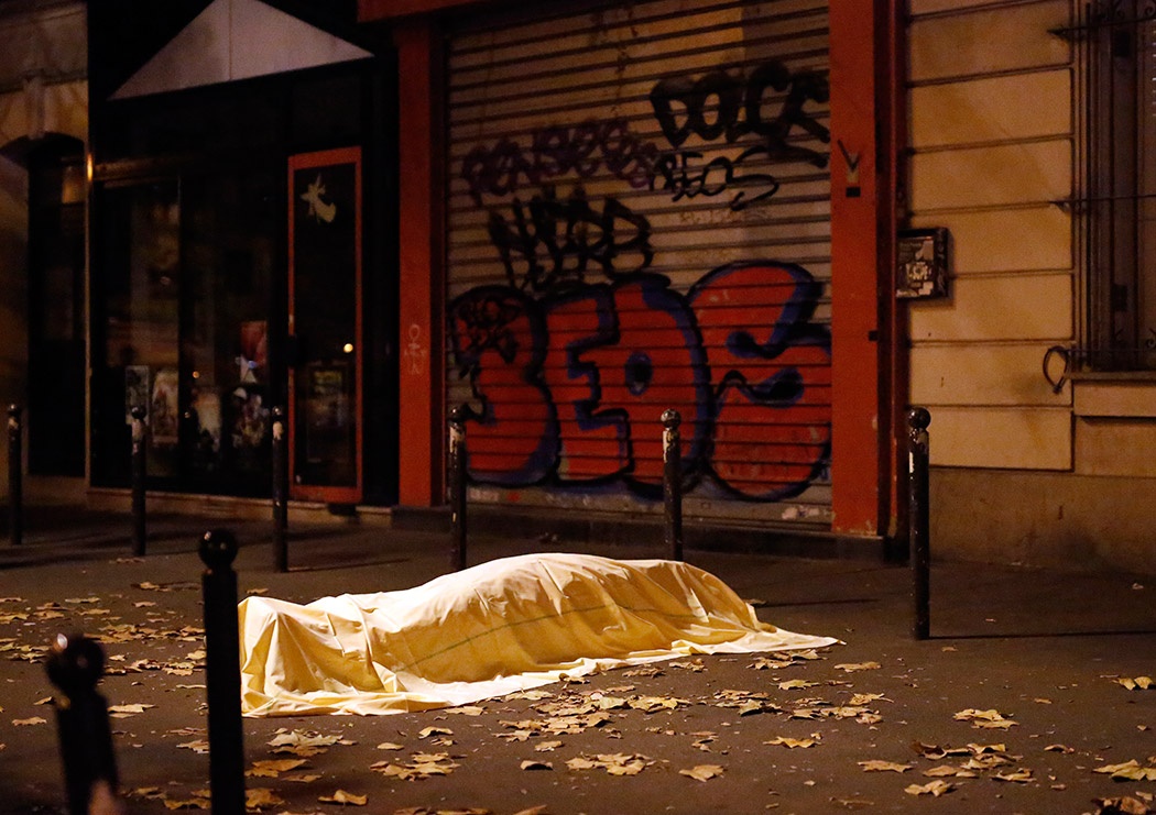 Một thi thể nằm bên ngoài nhà hát Bataclan sau vụ khủng bố đêm 13/11. Ảnh: AP
