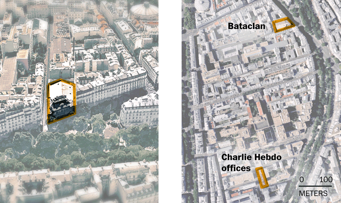 Vị trí nhà hát nằm không xa tòa soạn tạp chí biếm họa Charlie Hebdo bị tấn công hồi tháng 1. Đồ họa: Washington Post