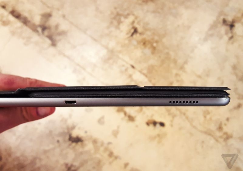 Tiếp đến là bàn phím. Không giống như thiết kế bằng phẳng của Microsoft Surface Pro, Smart Keyboard có thêm một phần nhô lên khá khó chịu. Điều này khó chấp nhận cho một sản phẩm do Apple thiết kế, nó không có được sự đồng bộ, nhất là khi Microsoft đã ra mắt sản phẩm tương tự 2 năm trước đó.