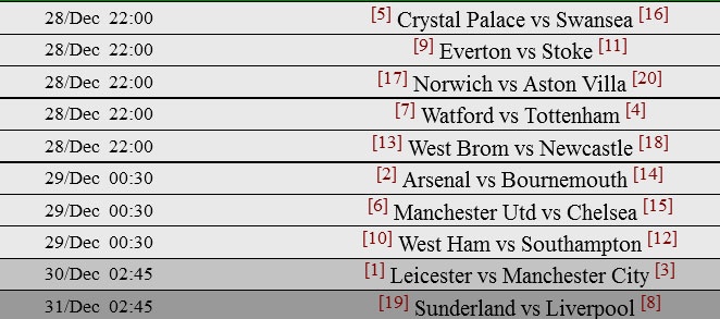 Ngoài ra, cặp đấu Leicester City và Man City cũng nhận được sự quan tâm lớn từ phía người hâm mộ. Sau chuỗi 10 trận bất bại, Leicester đã gục ngã trước Liverpool cuối tuần qua. Tuy nhiên, họ vẫn giữ được vị trí dẫn đầu do Arsenal cũng thua ở vòng 18 Premier League.