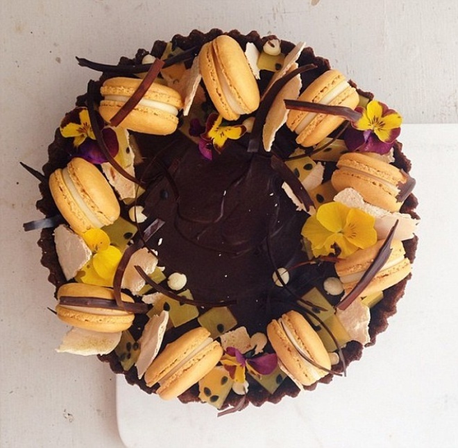 Một tác phẩm dự thi của 9X - bánh trứng chanh leo và chocolate, được trang trí với macaron, hoa có thể ăn được. |