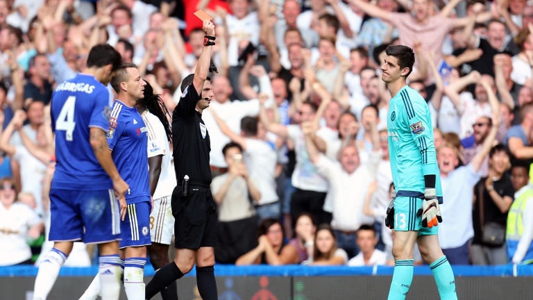 | Tấm thẻ đỏ của Courtois đẩy Chelsea vào thế khó. Ảnh: Sky Sports. |