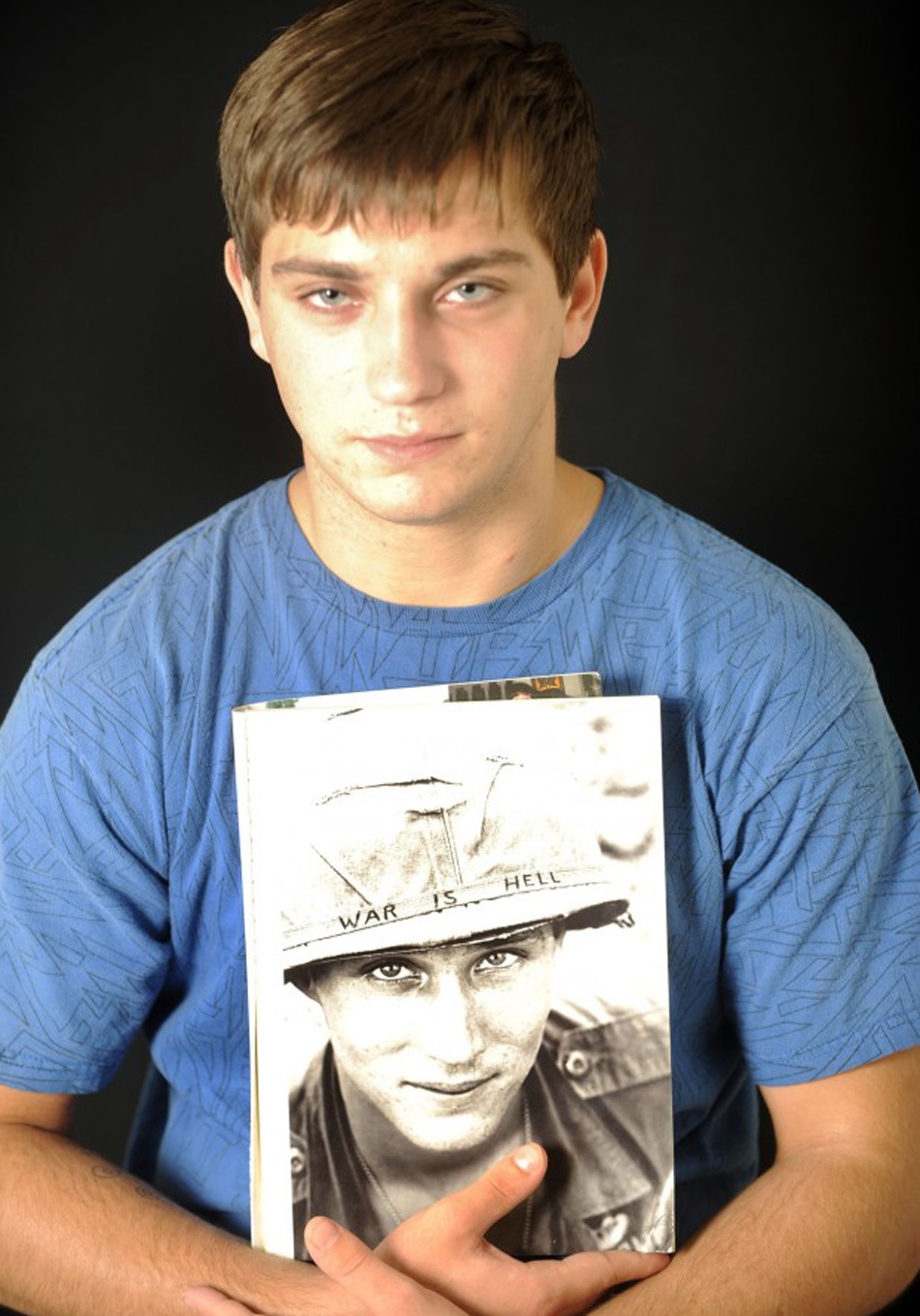 | Bức hình người lính khuyết danh đội mũ "Chiến tranh là địa ngục" (trái) và cháu trai Marcus Glander của ông. Nhiều người nhận xét Glander rất giống ông thời trẻ. Ảnh: Famouspictures |