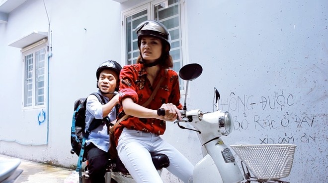 | Thanh Thảo không ngại làm ''xe ôm'' cho bạn trai thấp bé. |