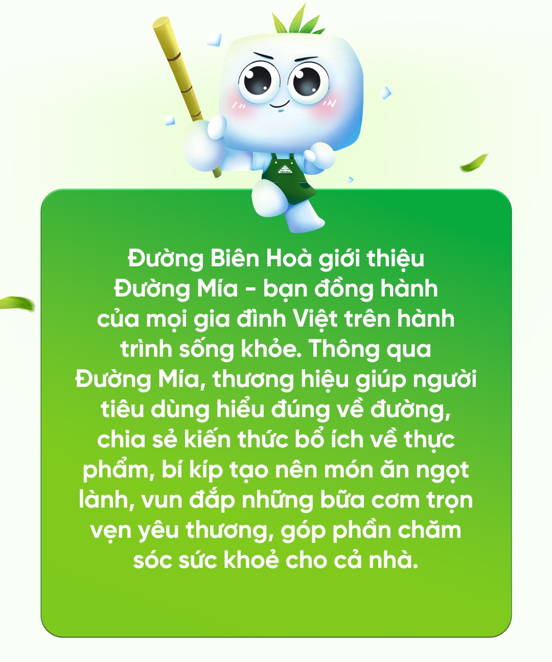 Dù đứng vào hàng ngũ thương hiệu hơn 50 năm tuổi đời, có chỗ đứng vững chắc trong lòng người tiêu dùng Việt Nam lẫn quốc tế, Đường Biên Hòa vẫn không ngừng nỗ lực để xác lập chiến lược, hình ảnh mới và tư duy mới. Tất cả hướng đến mục tiêu đến gần hơn nữa với người tiêu dùng trong nước lẫn quốc tế. Đó cũng là lý do Đường Biên Hòa giới thiệu Đường Mía - người bạn đồng hành của mọi gia đình Việt. Thông qua nhân vật mang hình dáng của tinh thể đường đáng yêu, Đường Biên Hòa giúp các bạn trẻ nói riêng và người tiêu dùng nói chung hiểu tường tận về nguồn gốc cây mía, dây chuyền sản xuất cũng như cách sử dụng đường khoa học.