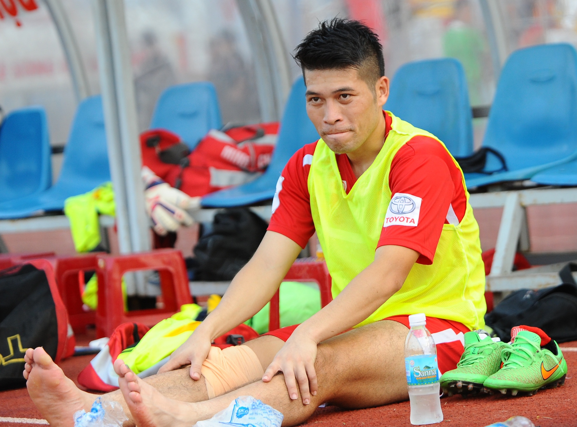 | Minh Châu gặp chấn thương phải rời sân trong trận đấu Hải Phòng - Hà Nội T&T ở vòng 22 V.League 2015. |