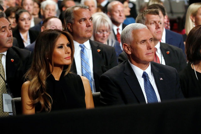 Vợ và "phó tướng" của ứng viên tổng thống đảng Cộng hòa chăm chú theo dõi màn tranh luận. Trước đó cả hai đều lên tiếng bênh vực và ủng hộ Donald Trump trước những bê bối liên quan đến phụ nữ.