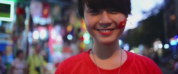 Tâm điểm của clip hướng về cô gái xinh đẹp cầm tấm biển màu đỏ với dòng chữ: Tôi là người Việt Nam. Tôi yêu hoà bình. Nếu bạn cũng thế, hãy ôm tôi" được viết bằng tiếng Anh.