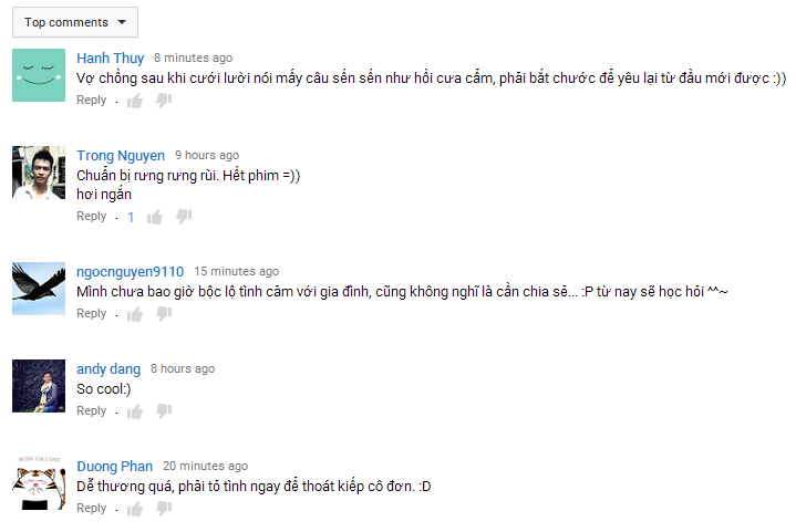 Phần lớn cư dân mạng đều hưởng ứng và đồng cảm với những câu chuyện, thông điệp trong clip. Dễ dàng bắt gặp rất nhiều ý kiến bày tỏ sự thích thú từ giới trẻ: “Dễ thương quá, phải tỏ tình ngay để thoát kiếp cô đơn thôi!”, “Mình chưa bao giờ bộc lộ tình cảm với gia đình, cũng không nghĩ là cần chia sẻ, từ nay phải học hỏi”, hay “Vợ chồng mình sau khi cưới lười nói mấy câu 'sến sến' như hồi cưa cẩm, phải áp dụng ngay để 'yêu lại từ đầu' mới được”.