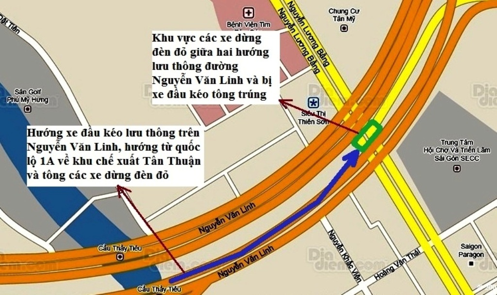 Lúc này, nhiều người đang dừng xe đèn đỏ tại trên phần đường Nguyễn Lương Bằng thì bất ngờ ôtô đầu kéo lưu thông với tốc độ cao trên đường Nguyễn Văn Linh, hướng từ quốc lộ 1A về khu chế xuất Tân Thuận lao đến.
