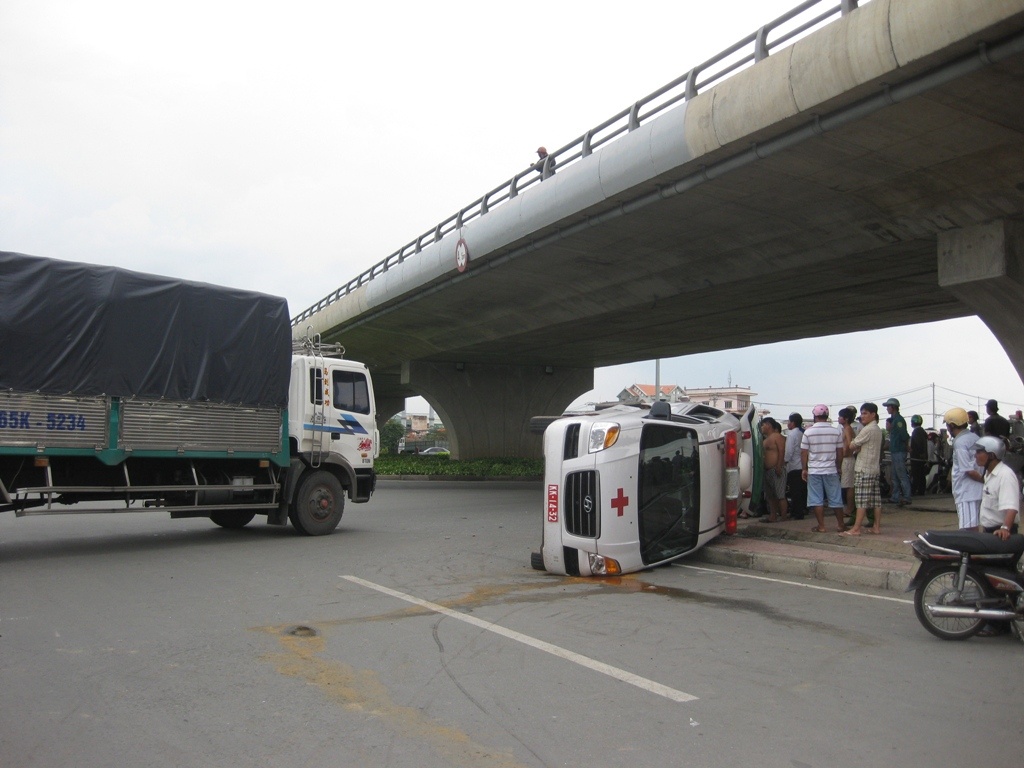| Hiện trường vụ tai nạn xe tải tông lật xe cấp cứu làm hai người bị thương. |