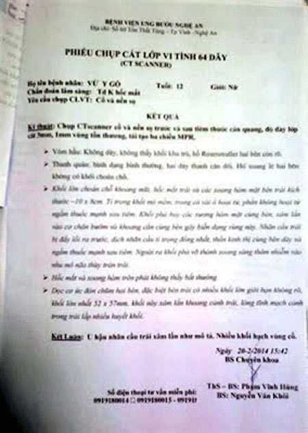 Ngày 20/2, cháu Gồ được đưa đến bệnh viện Ung bướu Nghệ An khám và nhập viện. Tại đây, các bác sĩ chẩn đoán, Gồ bị khối u Lympho Non Hodgkin hậu nhãn cầu, cần phải phẫu thuật cắt bỏ mắt trái, sau đó điều trị hóa chất nhiều đợt mới hy vọng cứu mạng sống.