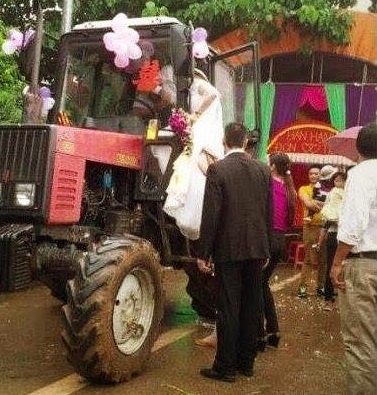 | Trong khi đó, cảnh rước dâu bằng máy cày diễn ra tại Thanh Hóa do tài khoản Bông Đông chia sẻ nhận được 1.000 like (thích). Các diễn đàn giải trí sau đó cũng đăng tải lại. "Những cơn mưa giông xuất hiện mấy ngày nay khiến người thân lo bão bất chợt đổ về, ảnh hưởng đến ngày vui của đôi trẻ. Thế nhưng, có thể tạm yên tâm vì chú rể đã tính cả rồi..." - một trang mạng viết. Ảnh: Bông Đông. |