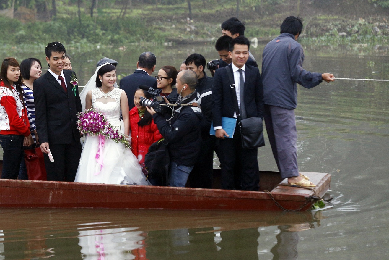 | Trọng tải con đò này chỉ được khoảng 10 người nhưng đoàn rước dâu có tới 20 người đứng lên trên. Đoàn đông người, họ phải chia làm hai tốp lần lượt sang sông. |