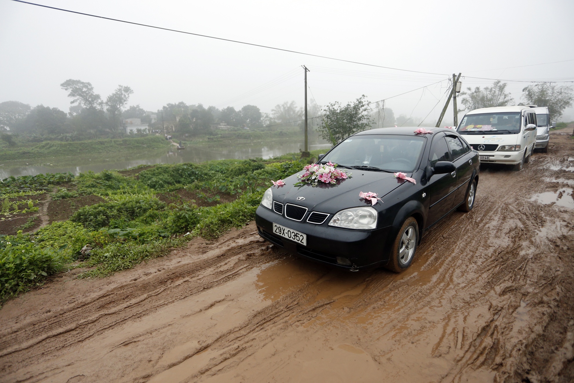 | Đoàn rước dâu vừa vất vả qua sông thì gặp phải con đường sình lầy ngay sau đó vì cơn mưa trước đó một ngày. |