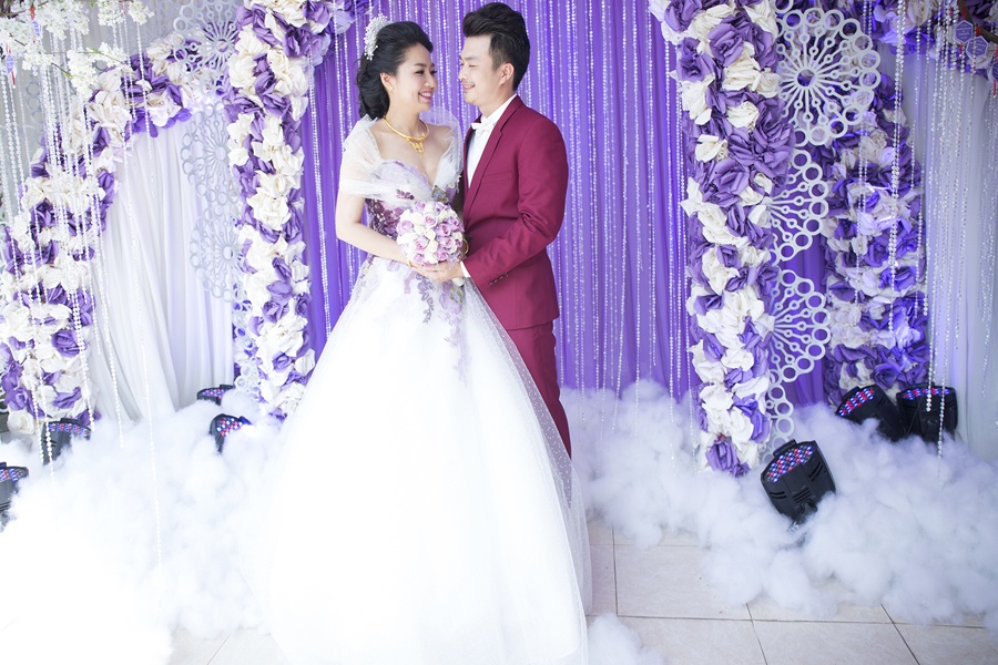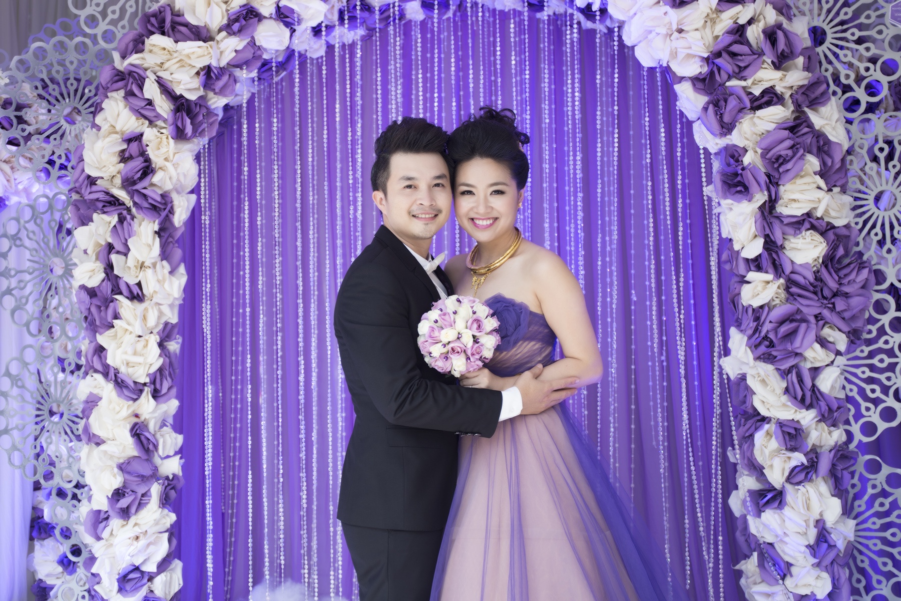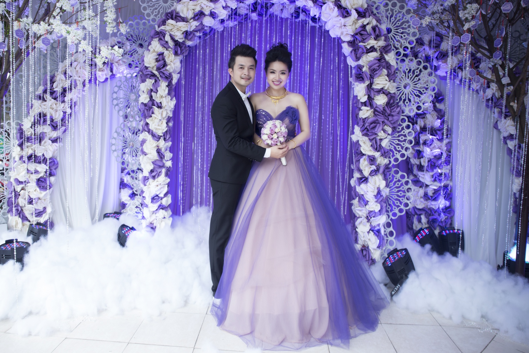| Trong lễ cưới tại Tiền Giang, cô dâu Lê Khánh diện hai bộ váy cưới của NTK Hoàng Hải. Thiết kế thứ hai có tông màu tím lãng mạn, chất liệu voan ren nhẹ nhàng, tinh tế. Bó hoa của nữ diễn viên cũng rất ăn nhập màu máy. |