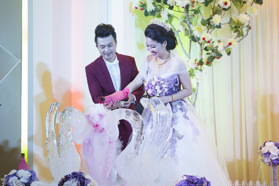 | Cô dâu và chú rể bắt đầu nghi lễ thành hôn với phần rót rượi mừng, công bố tiệc mừng bắt đầu. |