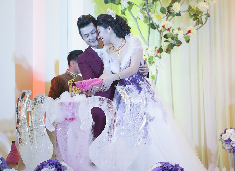Sau khi hoàn tất các nghi lễ vu quy, chào hỏi hai họ, cặp đôi diễn viên đãi tiệc mừng tại một nhà hàng sang trọng ở trung tâm thành phố Tiền Giang.