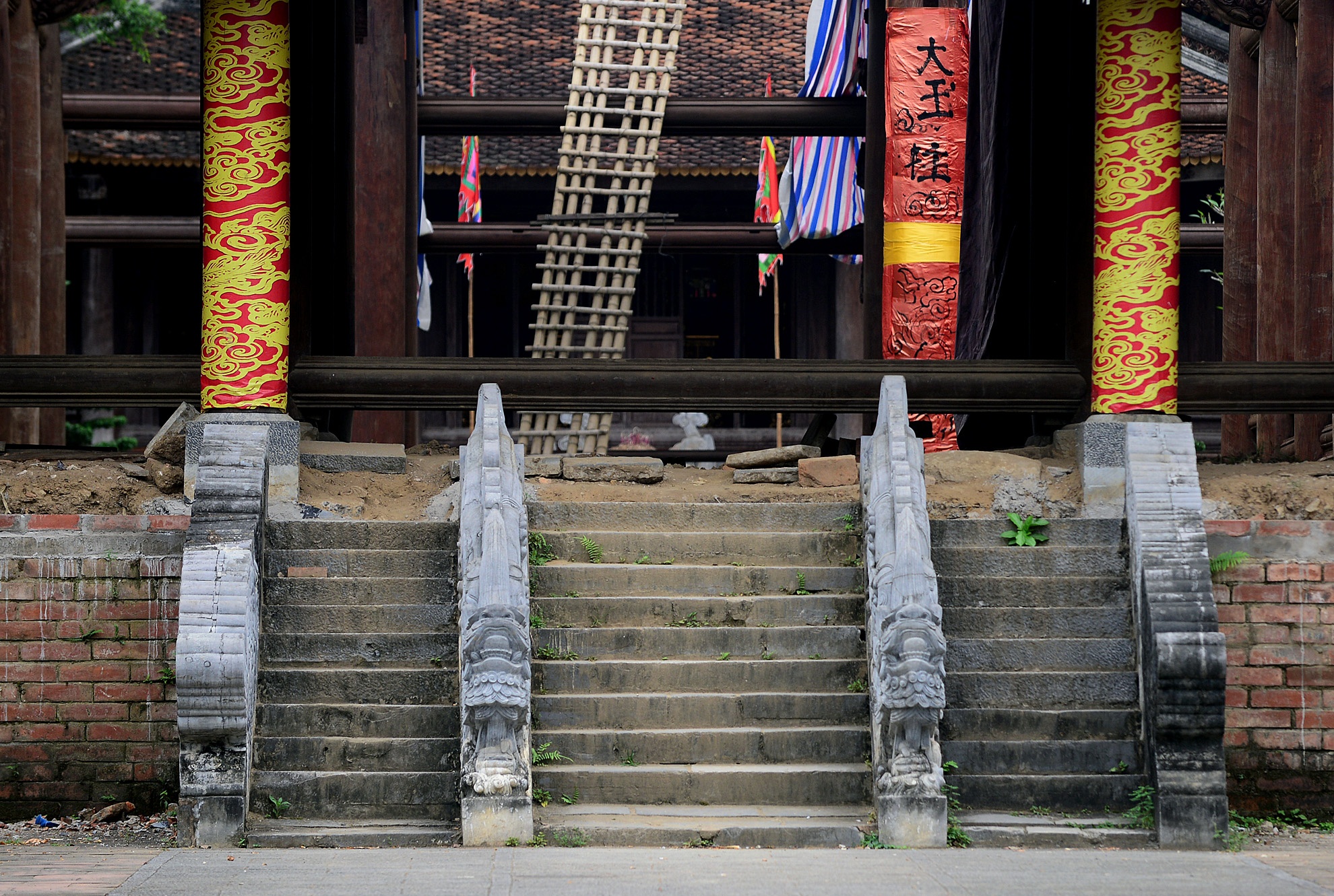 | Nối giữa sân rồng và chính điện là thềm rồng, gồm 9 bậc với hai đôi rồng đá đặc trưng của rồng thời Lê. Phía sau điện Lam Kinh, Thái miếu chạy theo hình vòng cung ôm lấy khu chính điện. |