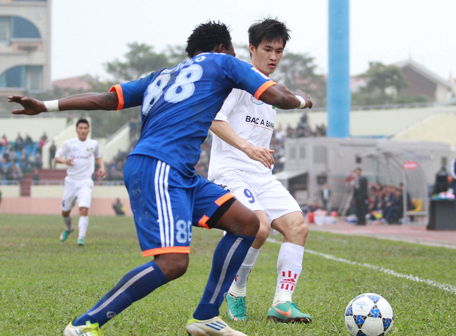 | Trong trận mở màn V.League 2014, đội trưởng của SLNA bị hậu vệ Than Quảng Ninh theo kèm chặt chẽ, không thể ghi bàn. |