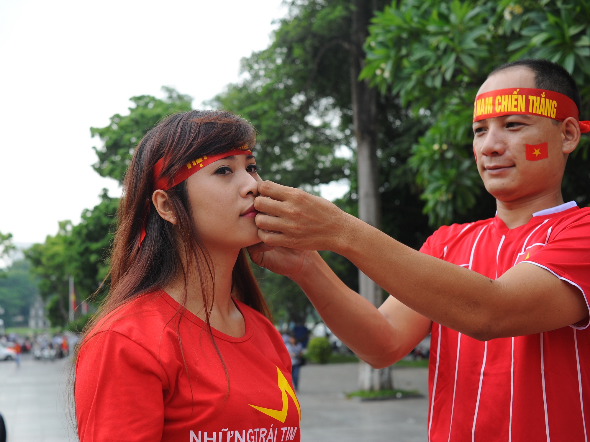 | Họ cùng nhau chuẩn bị những trang phục cổ động trước khi diễu hành tiến về sân Mỹ Đình. |