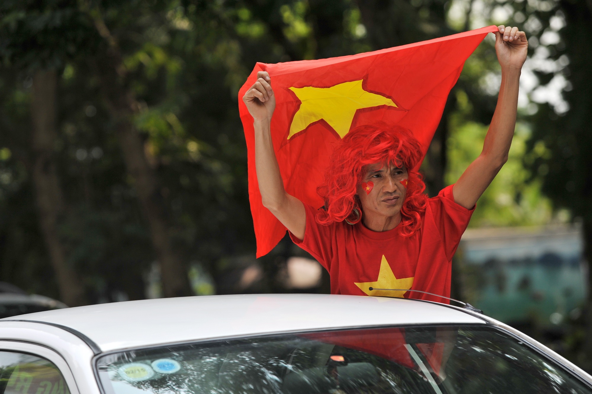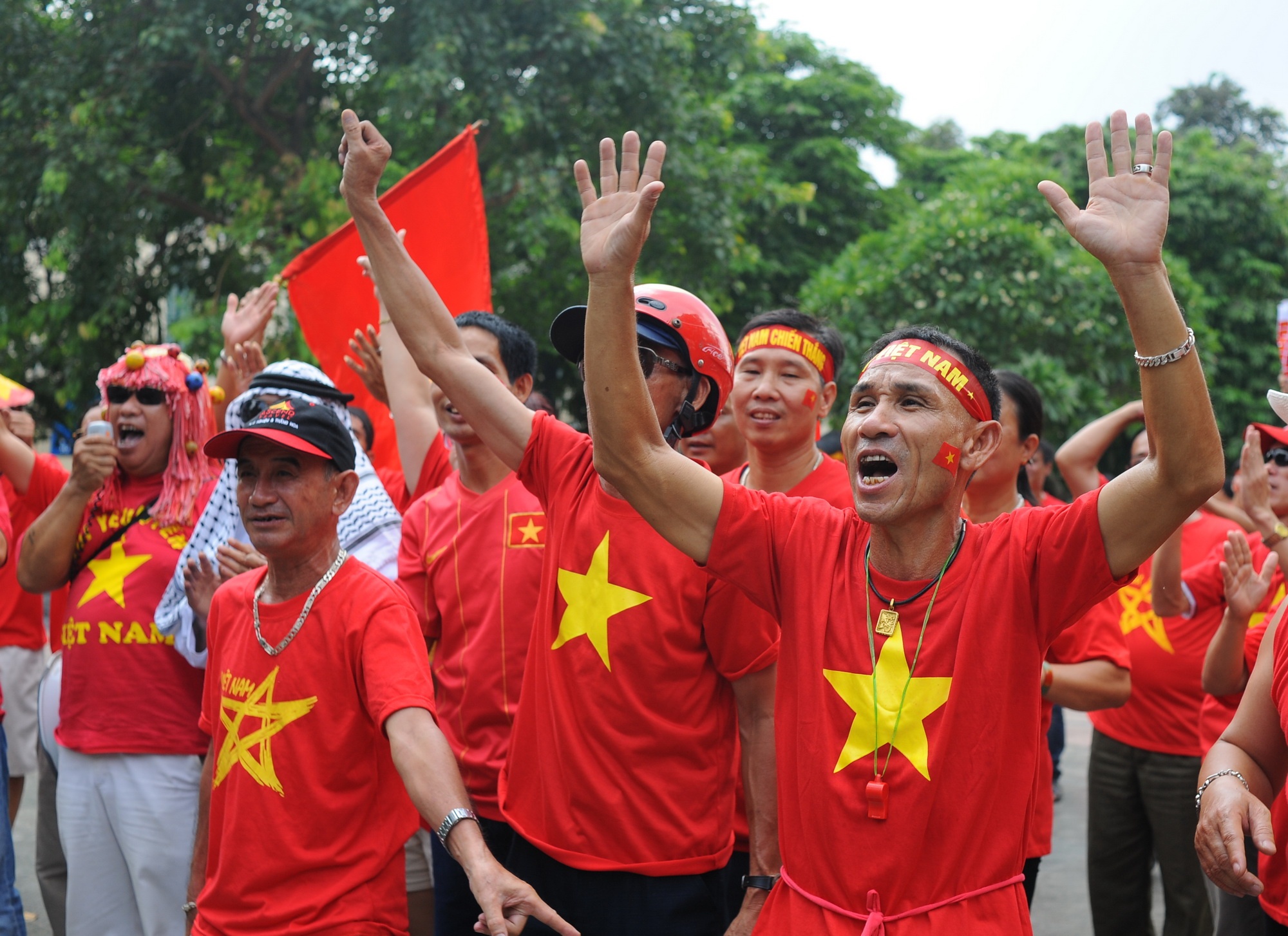 | Đoàn CĐV Việt Nam tập trung trước cửa nhà Đại tướng Võ Nguyên Giáp - số 30 Hoàng Diệu trước khi tiến về sân Mỹ Đình. |