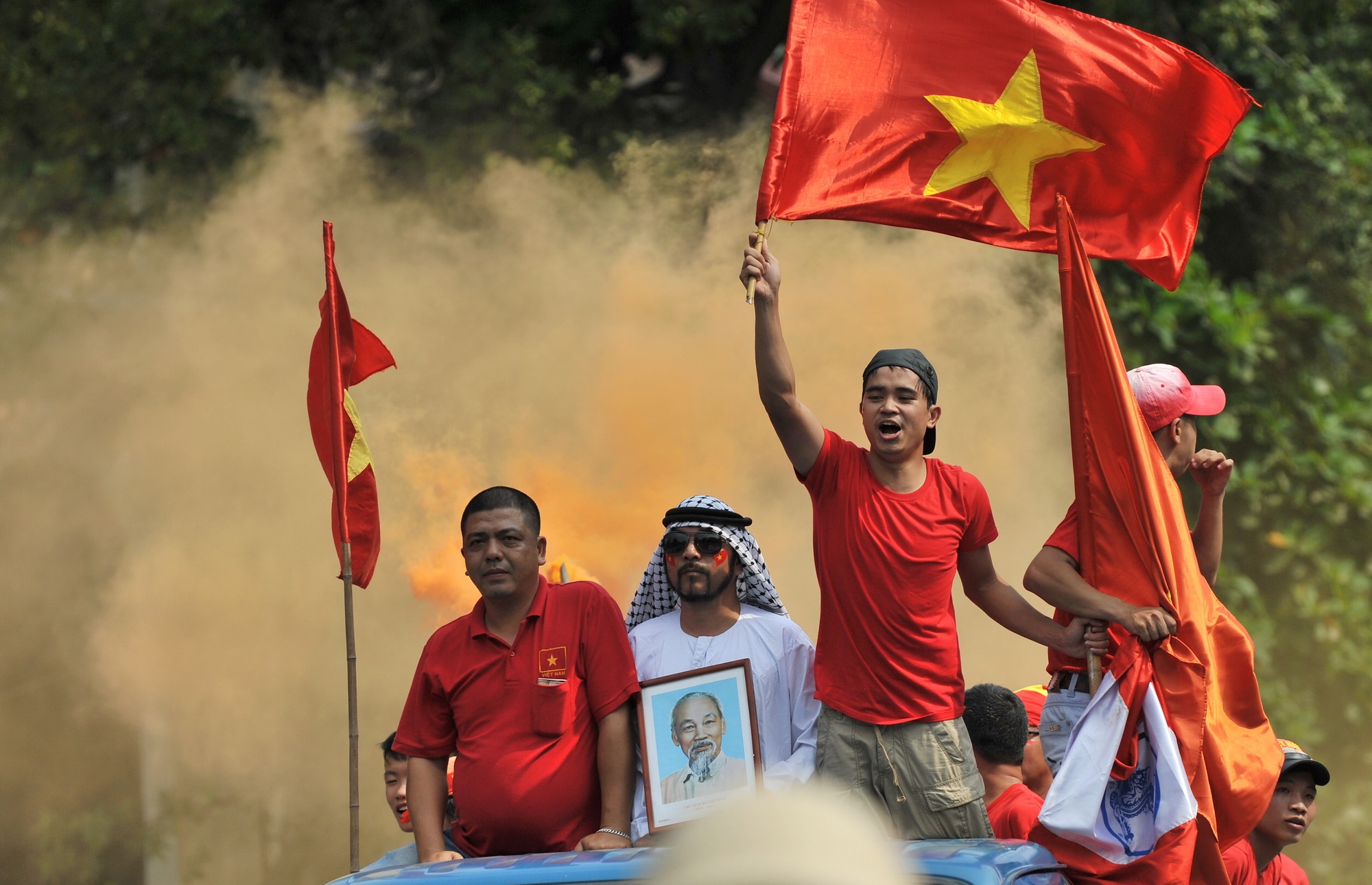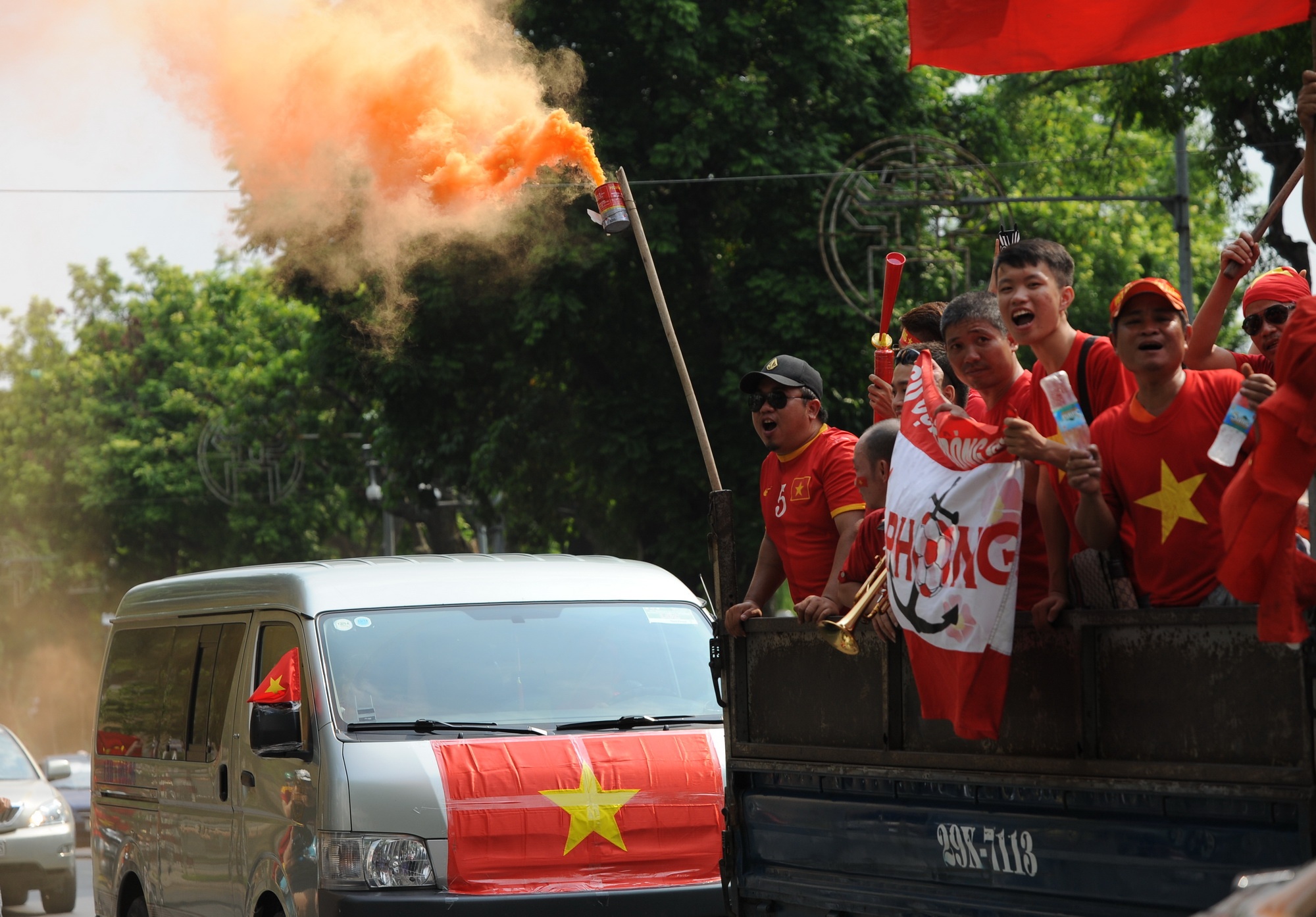 | Những cổ động viên từ Hải Phòng, Hải Dương, Hưng Yên, Nam Định, Ninh Bình, Nghệ An... cùng nhau tụ họp trước Tượng đài Lý Thái Tổ và bắt đầu hành trình diễu hành khắp các phố phường Hà Nội. |