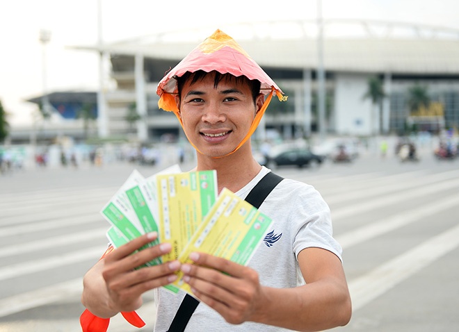 Một người hâm mộ vui mừng khoe những chiếc vé vào sân sau khi xếp hàng mua vé từ 5h sáng. Cảnh tượng "rồng rắn" xếp hàng mua vé từ sớm trước các trận đấu đã trở nên quá quen thuộc ở giải U19 Đông Nam Á - Cup NitiFood 2014. Ở trận gặp Nhật Bản, vé 70.000 đồng được "phe vé" bán 100.000 đồng, vé khán đài A, B mệnh giá 100.000 đồng được nhiều người hỏi mua nên bị đẩy giá 200-250.000 đồng. Trước trận, vé vẫn còn rất nhiều do tính chất không quan trọng của trận đấu này.