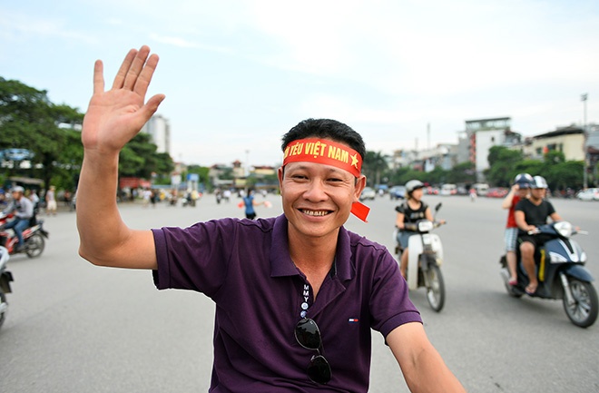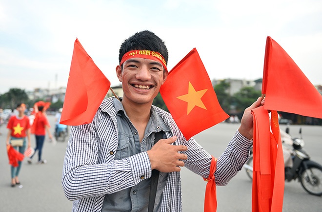 Lâm - sinh viên ĐH xây dựng - tươi cười dù chỉ bán được 4 lá cờ cùng một số khăn đeo trước trận đấu. Với Lâm, hòa chung không khí cổ vũ U19 Việt Nam cùng mọi người là điều quan trọng và vui nhất.