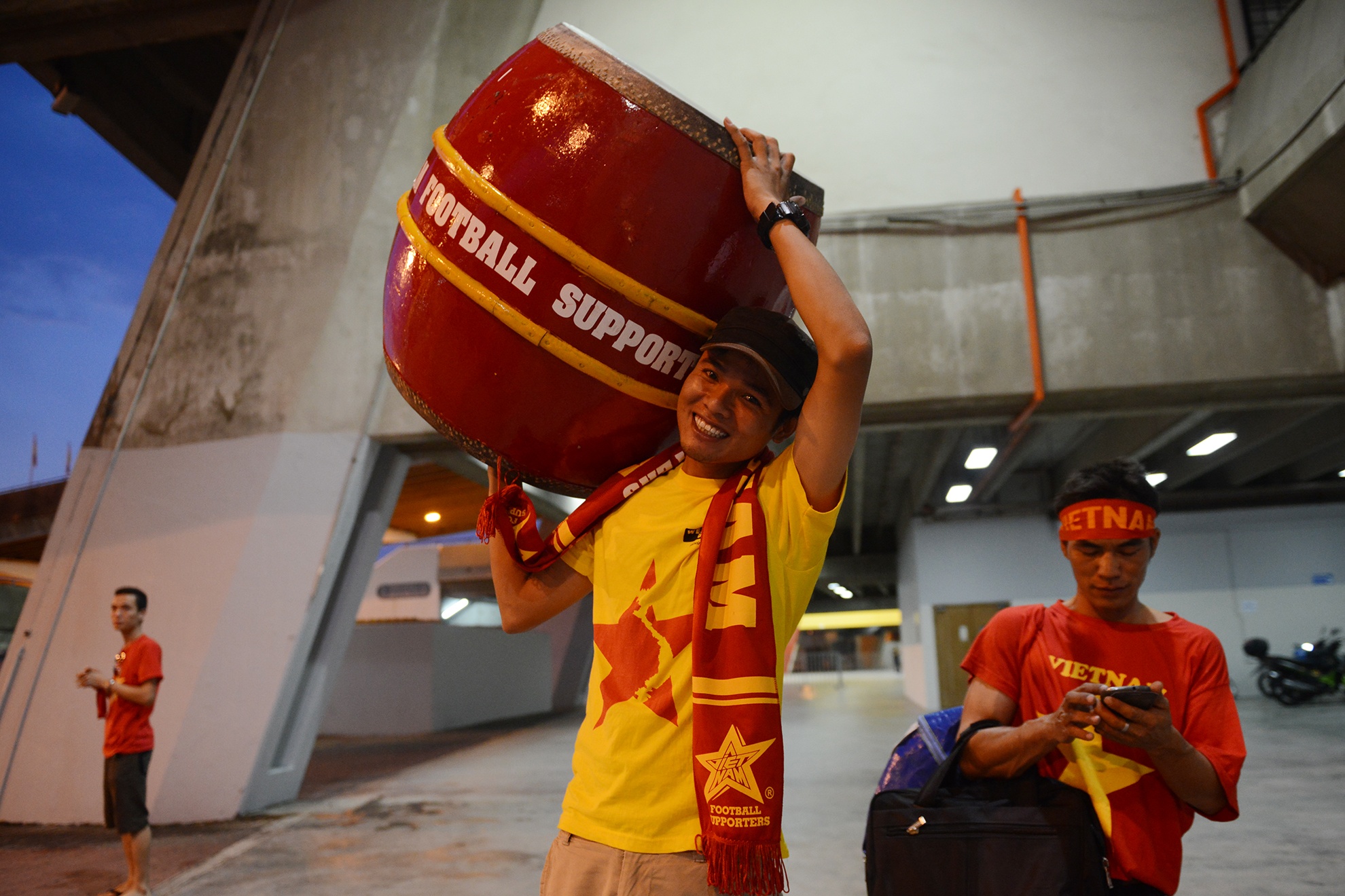 Bên ngoài, người hâm mộ đến sân dần đông hơn, có người vác theo cả trống lớn để tiếp sức cho các cầu thủ "con cưng".