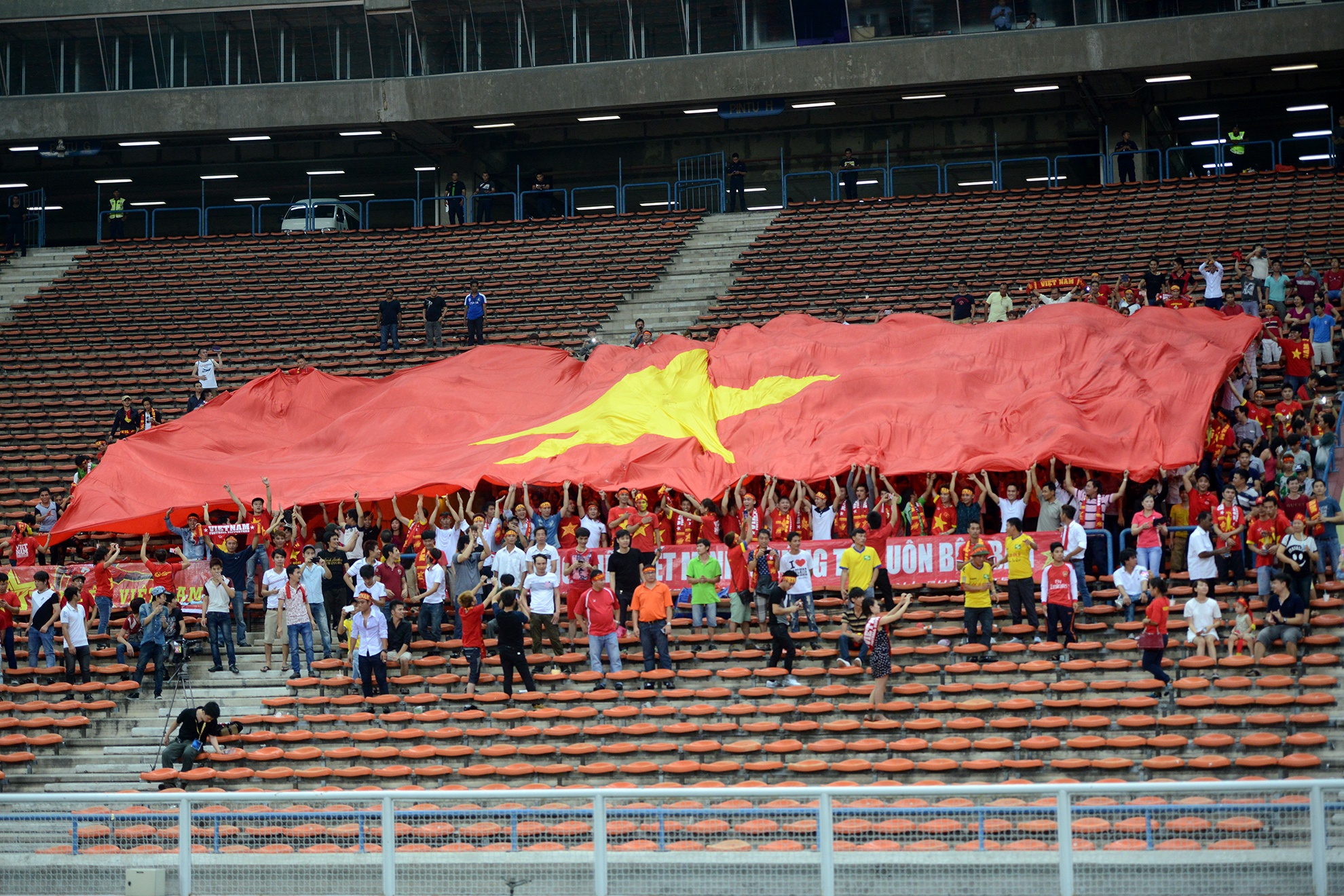 | Lá cờ tổ quốc khổng lồ đã được căng trên khán đài A sân Shah Alam trong lễ chào cờ của đội tuyển U23 Việt Nam. |