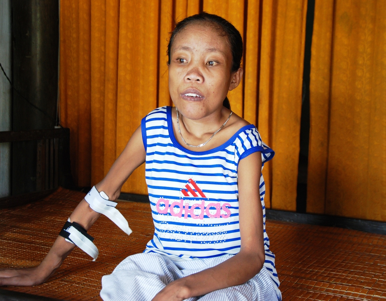 Nhiều năm nay, vì mắc bệnh hiểm nghèo nên thân hình chị Hoà (ngụ xã Võ Ninh, huyện Quảng Ninh, Quảng Bình) teo tóp, dị dạng khác thường. Cao chưa đầy 1,4 mét và nặng gần 30 kg, xương sống của Hoà cong lại, chân tay loằng ngoằng. Nếu không biết bị bệnh, rất ít người nghĩ rằng cô mới 26 tuổi.