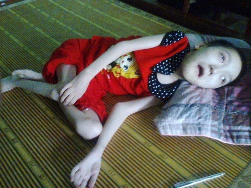 “Cuộc sống của nó bây giờ không khác gì cây cỏ. Chân, tay đã teo tóp hết cả còn người thì hoàn toàn không cử động được, không nói được. Mọi sinh hoạt đều phải có người trợ giúp, muốn điều gì, con bé cũng chỉ có thể biểu hiện bằng những tiếng ú ớ mỗi khi khóc hay cười”, cô Nguyễn Thị Bảy, mẹ em Giang nghẹn ngào.