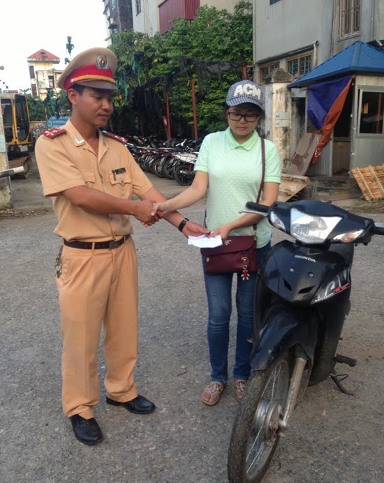Ngày 3/10, Đội cảnh sát giao thông số 14 (Công an Hà Nội) cho biết, quá trình xử lý phương tiện vi phạm giao thông, thiếu úy Phạm Hồng Bảo và thượng sỹ Nguyễn Thị Mỹ Hạnh đã xác minh, phát hiện chiếc xe máy Honda Wave là tang vật vụ trộm cắp tài sản vào năm 2013. Người đăng ký xe là anh Lê Duy Hoà, ở quận Tây Hồ (Hà Nội).