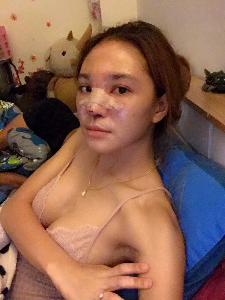 Chiếc mũi của cô gái cũng nhiễm trùng nặng do tay nghề của bác sĩ tại đây không đảm bảo. Taiwanrat quyết định đăng hình ảnh gương mặt biến đổi đến khó tin của mình lên Facebook như một lời khuyến cáo với các bạn trẻ.